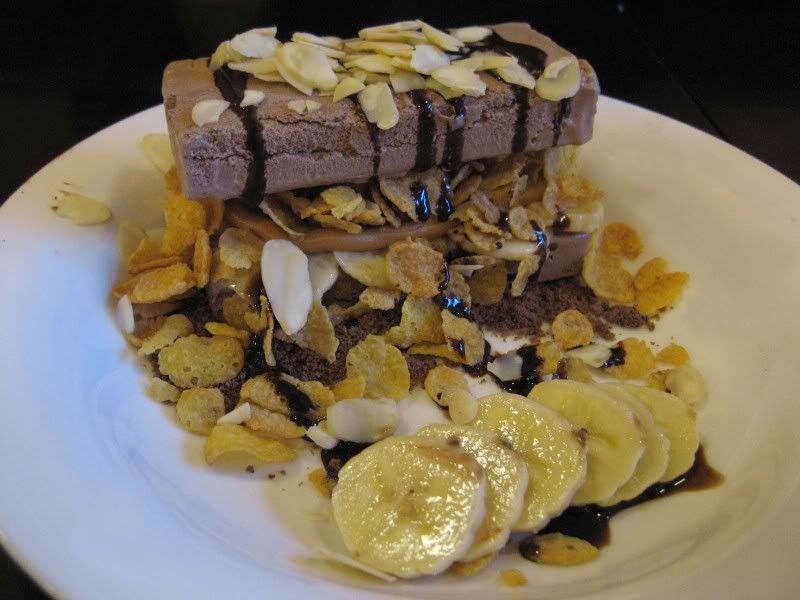Basically crushed cookies, 2 layers of chocolate ice-cream slabs and peanut butter topped with lots of cornflakes and almond flakes. Absolutely sinful, but she liked it.